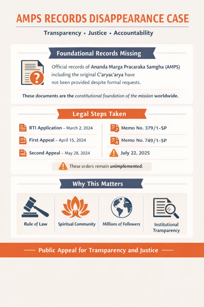 It is with deep concern that many members and observers of the Ananda Marga community have noted a troubling situation regarding the official records of Ananda Marga Pracaraka Samgha (AMPS), which constitute the constitutional and organizational foundation of the Mission.