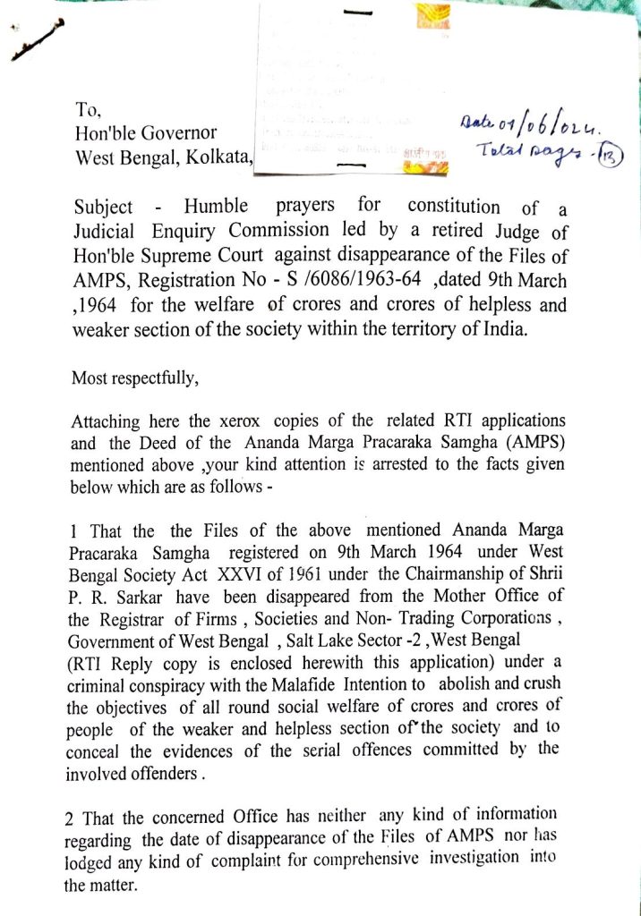 I respectfully submit this joint public and constitutional appeal in the interest of justice, transparency, and moral governance concerning the unresolved disappearance of official registration records of Ananda Marga Pracaraka Samgha (AMPS).