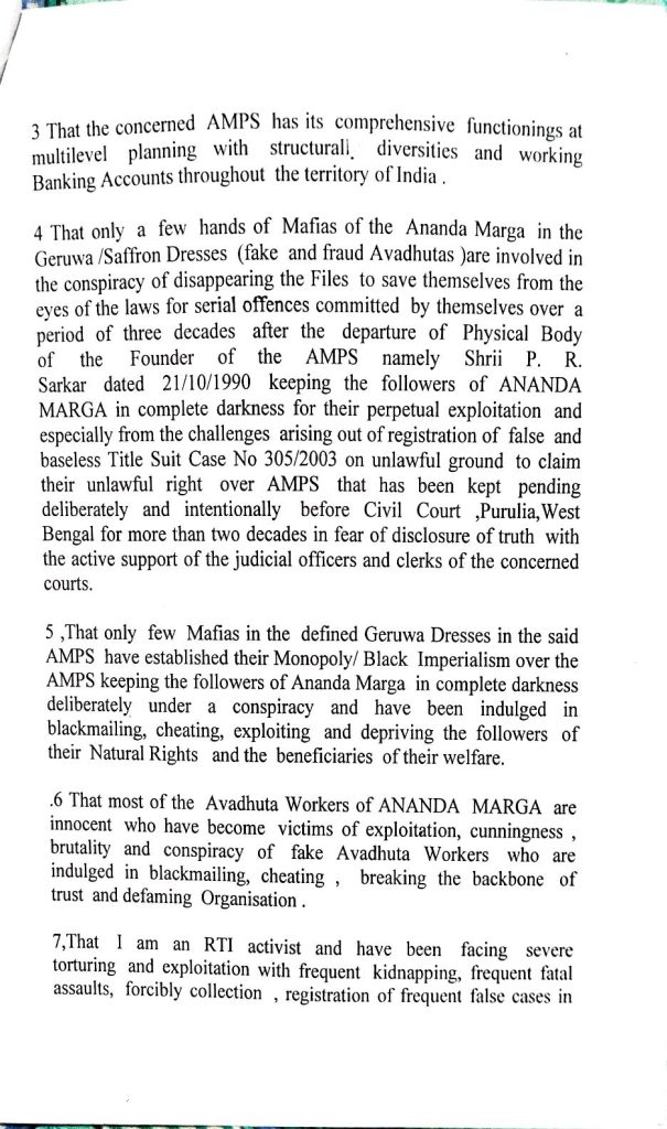 This case concerns the disappearance of all registered files and constitutional documents of Ananda Marga Pracaraka Samgha (AMPS), including its original Cโaryacโarya.